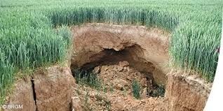 - Les effondrements de cavités souterraines : l'évolution des cavités souterraines naturelles (dissolution de gypse) ou artificielles (carrières et ouvrages souterrains) peut entraîner l'effondrement du toit de la cavité et provoquer en surface une dépression généralement visible, le plus souvent comme un trou de forme circulaire.