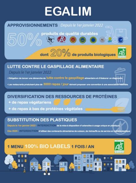 A noter que la Loi EGALIM impose au 1er janvier un total hors taxe de 50 % de produits de qualité dont au moins 20 % en agriculture biologique.
