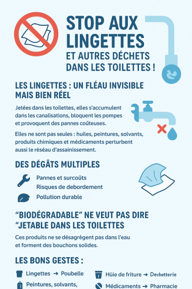 Elles sont pratiques, sentent bon, et promettent souvent d’être “biodégradables” ou “jetables dans les toilettes”. Pourtant, les lingettes sont aujourd’hui l’un des pires ennemis de nos systèmes d’assainissement collectif. Et elles ne sont pas seules : huiles, peintures, solvants, produits chimiques, médicaments… tous ces déchets jetés dans le réseau d’assainissement collectif ont des conséquences graves, à la fois techniques et environnementales.